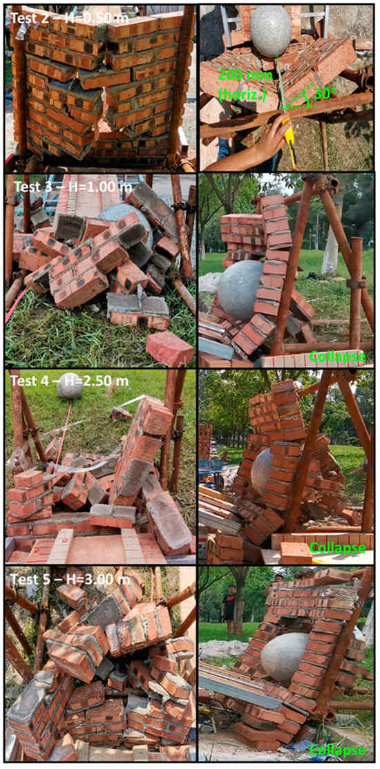 For the first three out of seven tests, the same wall was used, and the release height (H) was 0.25 m. The test was repeated until the wall was substantially damaged. For the rest of the tests, a different wall was used each time, and the release heights were 0.5, 1, 2.5, and 3 m, respectively. The release height was the unique variable.