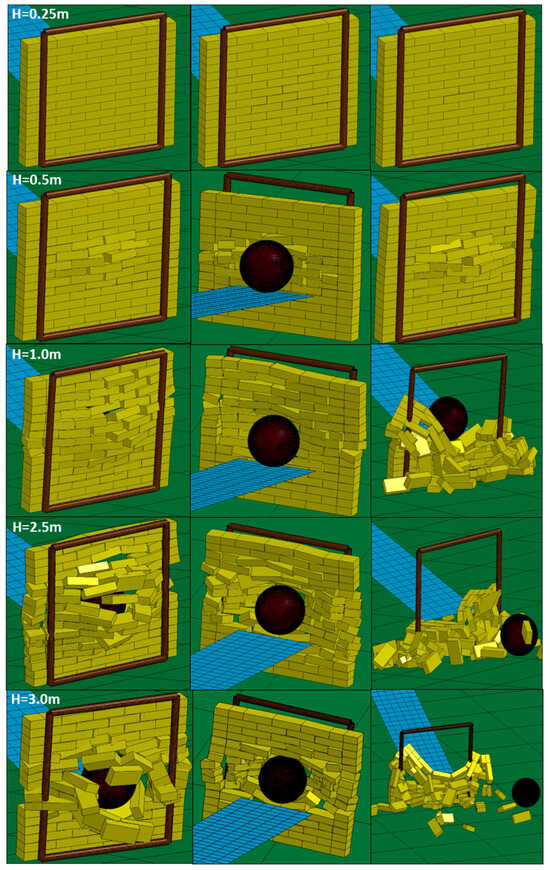 Five numerical simulations were performed to reproduce the physical testing for the five release heights (H), 0.25, 0.50, 1, 2.5, and 3 m (considering undamaged walls), and to calculate the impact velocities and energies. The final damage state as calculated by the numerical tests is presented in Figure 5. For H = 0.25 m, horizontal cracks are formed, as in test 1a. For H = 0.50 m, as in test 2, a flexural mechanism of failure deforms the wall in the directly impacted area; in this case, the numerical model realistically reproduces the failure of the brick–wall bond; however, it does not reproduce the failure of the bricks as in the experiment. For H = 1.0 m, H = 2.5 m, and H = 3.0 m, collapse takes place similarly to in tests 3, 4, and 5, and it occurs due to the same local shear failure mechanism.