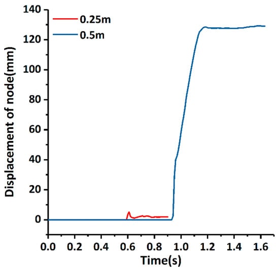 Figure 6 presents the displacement of a node in the centre of the boulder–wall interaction area for H = 0.25 m and H = 0.5 m. For H = 0.25 m, the peak wall displacement is elastic (t = 0.6 s). For H = 0.5 m, after t = 1.1 s, the displacement becomes plastic, with subsequent dissipation of energy up to the formation and extended opening of cracks. The transition from an elastic to a plastic response is indicated in the numerical model by the failure of the brick–mortar bond. The calculated nodal displacements for H = 0.25 m and H = 0.5 m are 5.0 mm and 129 mm, which are consistent with the values of 6.0 mm and 120 mm that were observed in tests 1a and 2, accordingly.