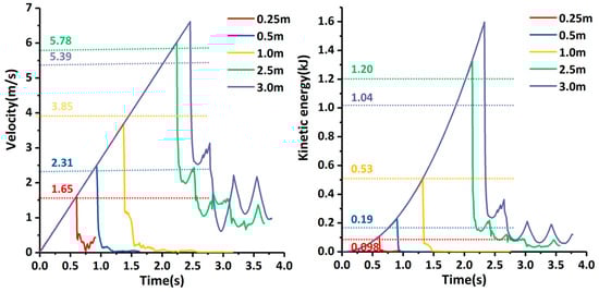 The total energy dissipated by the impact was calculated from the chart as the difference between the peak value minus the maximum kinetic energy after the steep drop. For H = 0.25 and H = 0.5 m, the boulder’s energy, which was 107 J and 250 J, respectively, was fully dissipated, and the block did not transverse the wall. Instead, for the release heights of H = 1, H = 2.5, and H = 3 m, the boulder’s kinetic energy dropped by 49 J, 117 J, and 135 J, accordingly, which represented 99%, 89%, and 84% of the impact energy.