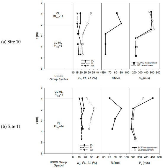 There is considerable scatter in the data shown in Figure 4, which is typical for field testing in variable soil profiles. The trends in the water content–shear wave velocity data are relatively stronger than shown for the suction–shear wave velocity data. Ideally, vs. would be plotted against matric suction since it is the component of total suction that influences mechanical behavior the most. Total suction measurements are significantly influenced by soil type and chemistry of the pore water, which likely explains the lack of stronger trends in this plot. It is known that salt contents in natural soils can significantly influence the total suction measurement, and therefore total suction is not always a good surrogate for matric suction when salt is present (e.g., [15]). In spite of the scatter, trends in Figure 4 show the strong dependence of shear wave velocity on water content at each site.