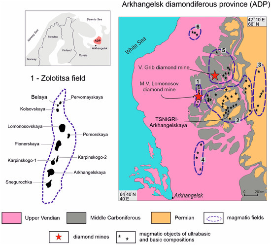 The Devonian–Upper Carboniferous ADP (410–340 Ma; [11,12,13,14]) is located in the northern region of the East-European Platform and is confined to the possible south continuation of the Kola craton [38,39]. The ADP is conventionally divided into six magmatic fields (Figure 1) represented by different types of ultramafic (e.g., kimberlite, olivine melilite/picrite, and carbonatite) and mafic (basalt) rocks in the form of pipes, dykes, and sills [19]. The kimberlite pipes are located within the Zolotitsa (including the M. V. Lomonosov diamond deposit), Kepino, and Verhotina (including the V. Grib diamond deposit) fields (Figure 1). These pipes intrude into Vendian sediments and are overlain by middle Carboniferous to Permian terrigenous and carbonate rocks as well as unconsolidated Cenozoic sediments with a total thickness ranging from 20 to >100 m [12].