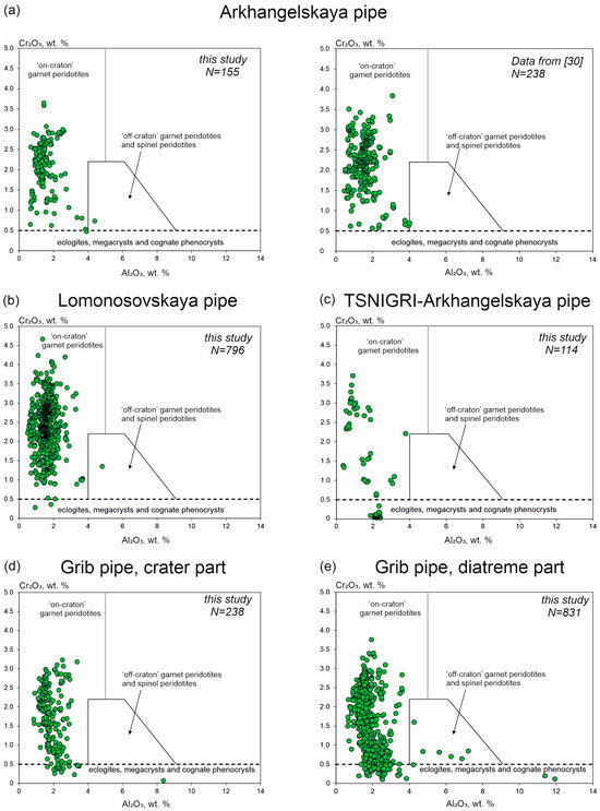 Clinopyroxene Cr2O3–Al2O3 discrimination plot (Ramsey and Tompkins, 1994 [56]) from the (a,b) Arkhangelskaya [30], (c) Lomonosovskaya, (d) TSNIGRI-Arkhangelskaya, and (e) V. Grib kimberlite pipes. N refers to the number of grains selected from the heavy mineral fraction of the crushed kimberlites.