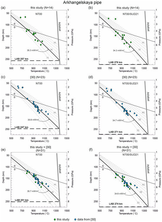 P–T plot of the mantle-derived clinopyroxene xenocrysts from the Arkhangelskaya kimberlite pipe based on data (a,b) from this study and (c,d) [30]; (e,f) the combination of these two datasets (without six grains which could be originated from the spinel peridotites) [30]. Calculated P–T values according to (a,c,e) NT00 [2,3] and (b,d,f) NT00/SUD21 [4]. Conductive model geotherms are based on [33]. The light grey adiabat is represented by a potential temperature of 1300 °C with a gradient of 0.3 °C/km [33]. The diamond (D)–graphite (G) transitional curve follows the findings of [57]. The black line presents the best-fit calculated geotherm; the misfit for each calculation can be found in Table 1. The black dotted line presents the lithosphere-asthenosphere boundary (LAB) taken from the intersection point between the adiabat and best-fit calculated geotherm. N refers to the number of grains that passed the compositional filter criteria [3,5,6].