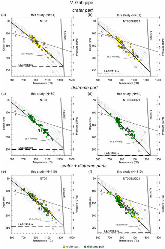 P–T plot of the mantle-derived clinopyroxene xenocrysts from the (a,b) crater and (c,d) diatreme regions of the V. Grib kimberlite pipe; (e,f) the combination of these two datasets. P–T calculations according to (a,c,e) NT00 [2,3] and (b,d,e) NT00/SUD21 [4]. Conductive model geotherms are based on [33]. The light grey adiabat is represented by a potential temperature of 1300 °C with a gradient of 0.3 °C/km [33]. The diamond (D)–graphite (G) transitional curve follows the findings of [57]. The black line presents the best-fit calculated geotherm; the misfit for each calculation can be found in Table 1. The black dotted line presents the LAB taken from the intersection point between the adiabat and best-fit calculated geotherm. N refers to the number of grains that passed the compositional filter criteria [3,5,6].