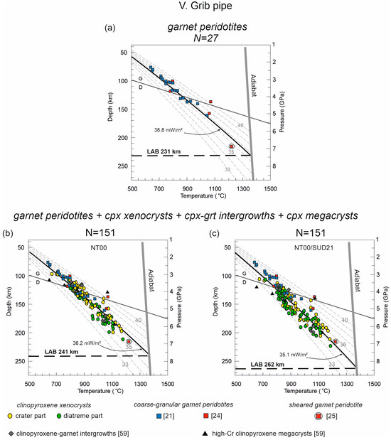 (a) P–T plot of the mantle-derived garnet peridotites as well as (b,c) when plotted together with clinopyroxene xenocrysts, clinopyroxene-garnet intergrowths and high-Cr clinopyroxene megacrysts from the V. Grib kimberlite pipe. P–T data on garnet-peridotites [21,24,25,59] together with P–T calculations for single clinopyroxene grains according to (b) NT00 [2,3] and (c) NT00/SUD21 [4]. Conductive model geotherms are based on [33]. The light grey adiabat is represented by a potential temperature of 1300 °C with a gradient of 0.3 °C/km [33]. The diamond (D)–graphite (G) transitional curve follows the findings of [57]. The black line presents the best-fit calculated geotherm; the misfit for each calculation can be found in Table 1. The black dotted line presents the LAB taken from the intersection point between the adiabat and best-fit calculated geotherm. N refers to the number of grains that passed the compositional filter criteria [3,5,6].
