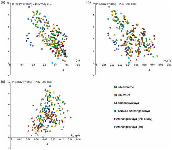 Correlation between the calculated P values (kbar) of NT00 and NT00/SUD21 with (a) Cr#, (b) ACrTs, and (c) Al apfu in Cr-diopside xenocrysts from the V. Grib, Lomonosovskaya, Arkhangelskaya, and TSNIGRI-Arkhangelskaya kimberlite pipes [30].