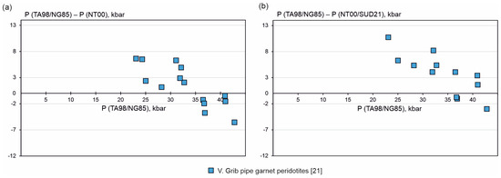 Comparison of P values of the V. Grib garnet peridotites [21] obtained using a combination of TA98/NG95 [62,65] with those obtained by (a) NT00 and (b) NT00/SUD21 for clinopyroxenes in these samples.