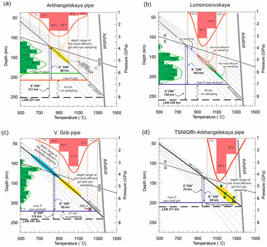 Reconstruction of the vertical distribution of garnet of lherzolite and harzburgite paragenesis (red histogram) and Cr-diopside (green histogram) xenocrysts within the lithospheric mantle beneath the (a) Arkhangelskaya, (b) Lomonosovskaya, (c) V. Grib, and (d) TSNIGRI-Arkhangelskaya kimberlite pipes. E “DW” refers to the expected width of the “diamond window”, which is defined as the interval between the graphite/diamond transition boundary and the LAB as estimated by finding the intersection between the calculated conductive geotherm and the mantle adiabat with a surface temperature of 1315 °C. R “DW” refers to the real “diamond window”, which is defined as the interval between the depth of the graphite/diamond transition and the depth of the maximum p values found in garnet and clinopyroxene xenocrysts. Data for garnets: Arkhangelskaya (242 grains [30,72]), Lomonosovskaya (367 grains [36,72]), V. Grib (635 grains [34,35] TSNIGRI-Arkhangelskaya (322 grains [35]. GDDD—global diamond depth distribution [2].