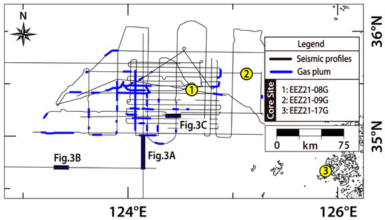 In the Gunsan Basin, the eastern part of the NSYSB, gas seepage is very active, as shown by the wide distribution of gas plumes along the survey lines, especially in the southwestern part of the area (Figure 1 and Figure 2). The gas seepage is not characteristically associated with pockmarks in the seafloor, similar to the southeastern Yellow Sea off the west coast of Jeju Island [20].