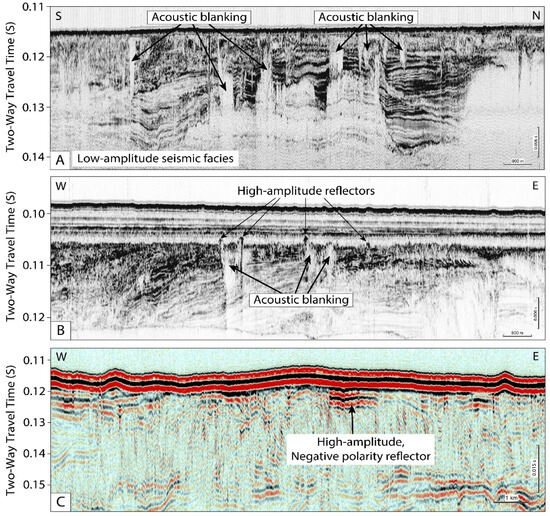 The acoustically turbid characteristic is thought to be caused by the partial charge of gases or gas bubbles, whereas the transparency is thought to be caused by high-pressure accumulated gases-at least above the limit of methane solubility-in sediment pore space [13,17,43]. As shown in Figure 3, the high-resolution seismic profiles include three types of acoustic anomalies in the study area. Acoustic blanking with low amplitude seismic facies penetrates the upper and lower sedimentary layers and forms a chimney shape (Figure 3A). In some study areas, it develops as a chimney shape characterized by strong amplitude at the top (Figure 3B). High-amplitude negative polarity reflectors develop around folds and faults in the study area. The extent of these anomalies varies from up to 1 km, mainly in the upper parts (Figure 3C).