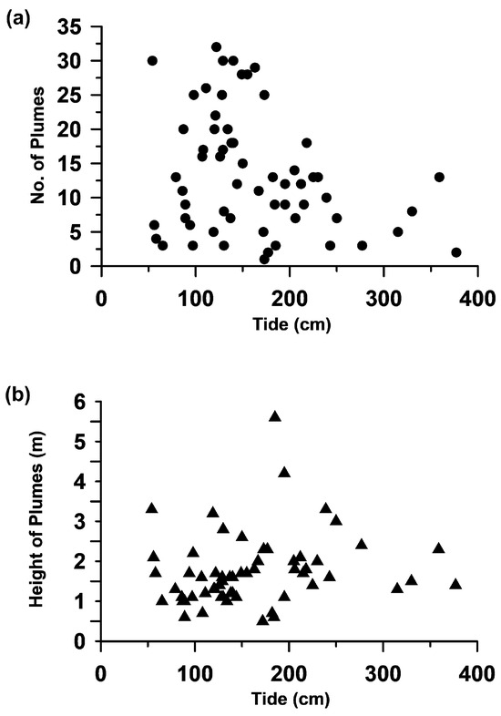 Relationships of number (a) and height of plumes to tidal range in the Gunsan Basin (b). The plume height is assumed to represent the seepage intensity.
