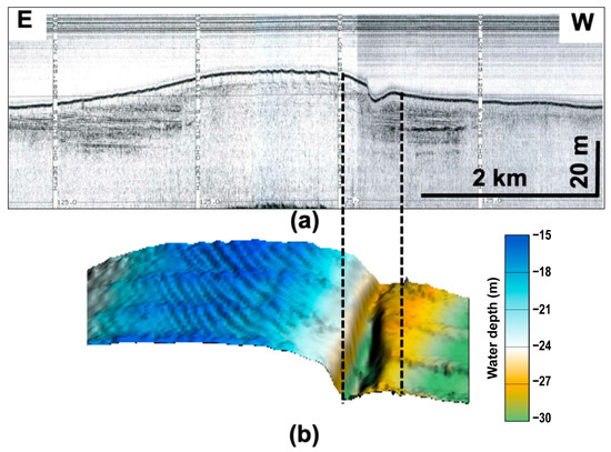 As shown on the chirp seismic profiles, a V-shaped crater and a diapiric dome occur in the eastern part of the Gunsan Basin (Figure 2, Figure 5a and Figure 6a). The mosaic of multi-beam images shows that the former is elongated and funnel-shaped with a width of ~250 m and a maximum depth of 7 m on the west side of a sedimentary ridge (5 km in length and 15 m in height), the top of which is rippled with sand waves (Figure 5b). The scale of this crater is larger than the scale of common pockmarks [45]. The sand waves are oriented in the NW–SE direction, oblique to the coast of western Korea, indicating the strong influence of tidal currents [8,35,39]. Internally, the ridge is acoustically transparent in the central part, whereas some acoustically enhanced internal reflectors occur parallel to the seafloor on both sides (Figure 5a). The diapiric dome, which is ~200 m wide and 4 m high, shows no internal sedimentary structures due to turbid reflection in the chirp seismic profile (Figure 6a). On the multi-beam echo sounding images, two distinctive diapirs with irregular but slightly concave-surfaced tops that are conical and elongated in shape, respectively, are apparent (Figure 6b). They are uplifted ~3–4 m above the surrounding seafloor. In particular, they are slightly moated on the west side, like those found in the southeastern Yellow Sea [20].