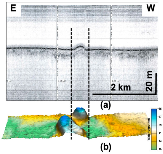 A diapiric dome on the Chirp seismic profile (a), but two domes are observed on the multi-beam echo sounding image (b). On the latter, the domes are about 4 m high, surrounded by a moat-like depression on the west side.
