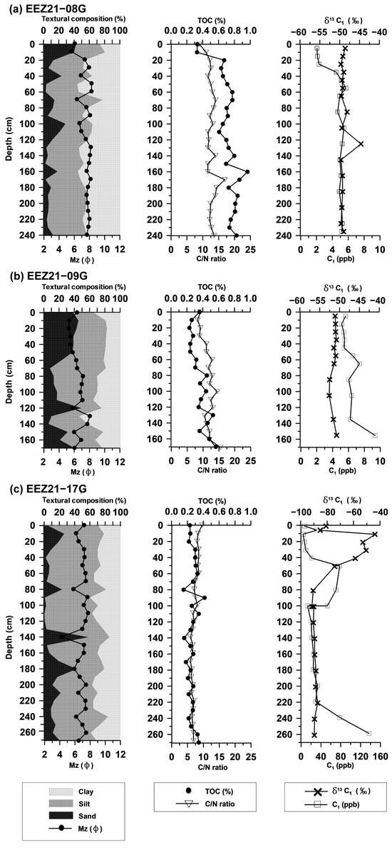 Distributions of geochemical characteristics, textural composition (%), mean grain size (), TOC (%), C/N ratio, CH4 (C1) concentration (ppb), and δ13C1 (‰) in core nos. EEZ21-08G (a), −09G (b), and −17G (c).