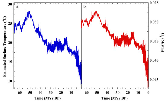 Figure 1. Cenozoic times series plot of (a) (blue line), the δ18O proxy estimate of Cenozoic sea surface temperature, TS [33]; (b) (red line), calculated Henry’s Law constant for seawater, HS, plotted with the ordinate decreasing upward. HS varies with Cenozoic TS.