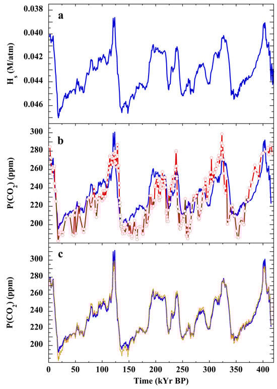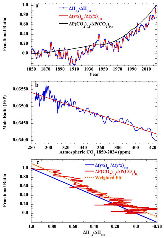 Figure 2a shows the coherence of the three ratios over the historical period, as predicted by Equation (9). In Figure 2b, H/P is linearly correlated with the historical atmospheric P(CO2) record, indicating that the gas/solute mole fraction varies directly with P(CO2). Finally, Figure 2c shows slopes of 1.00 for the Equation (9) correlation plots with H 0 H i H 0 H n . Specifically, the complete linearity of ΔH0,i/ΔH0,n vs. ΔP(CO2)0,i/ΔP(CO2)0,n empirically establishes the validity of employing the fractional change of Henry’s Law constant with SST, to discover the fractional change in P(CO2) as driven by SST.