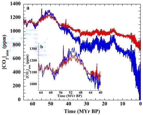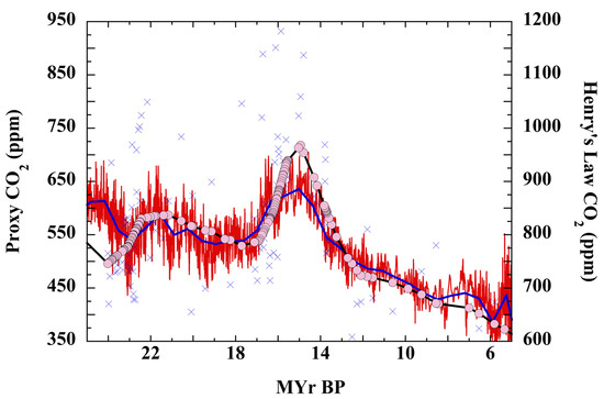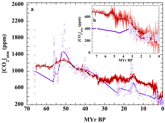 Figure 3. (a) (Blue points), P(CO2) (ppm) as calculated under the Null Hypothesis (Equation (14)), with Δ P C O 2 t o t a l = 862 ppm and the fractional ratio of the temperature-varying Henry’s Law constant for seawater (Figure 1). The red line is a 1% weighted Lowess smooth. Inset (b): expansion of the most recent 7.5 Ma.
