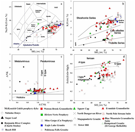 - Whalen, J.B.; Jenner, G.A.; Longstaffe, F.J.; Hegner, E. Nature and evolution of the eastern margin of lapetus: Geochemical and isotopic constraints from Siluro-Devonian granitoid plutons in the New Brunswick Appalachians. Can. J. Earth Sci. 1996, 33, 140–155. [Google Scholar] [CrossRef]