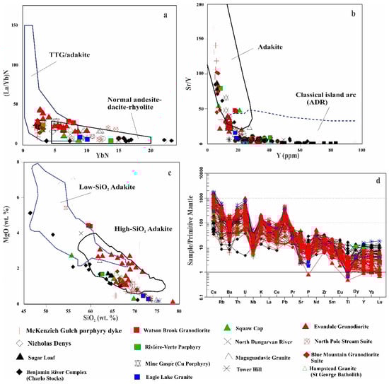 - Lentz, D.R.; Yousefi, F. Reconciling Adakite Geochemical Systematics: A review. In Abstracts 2022: Atlantic Geoscience Society Colloquium 2022; Fredericton, NB, Canada, 2022; p. 1. [Google Scholar]