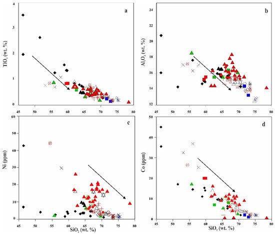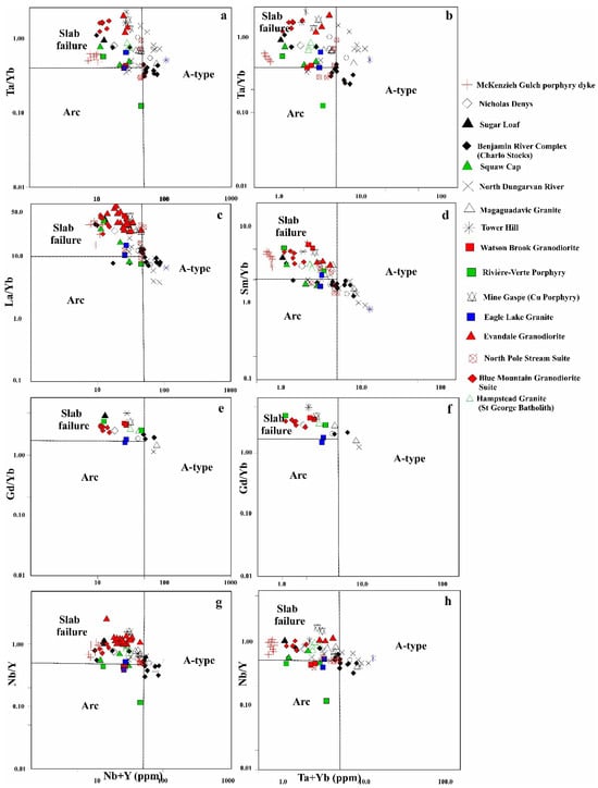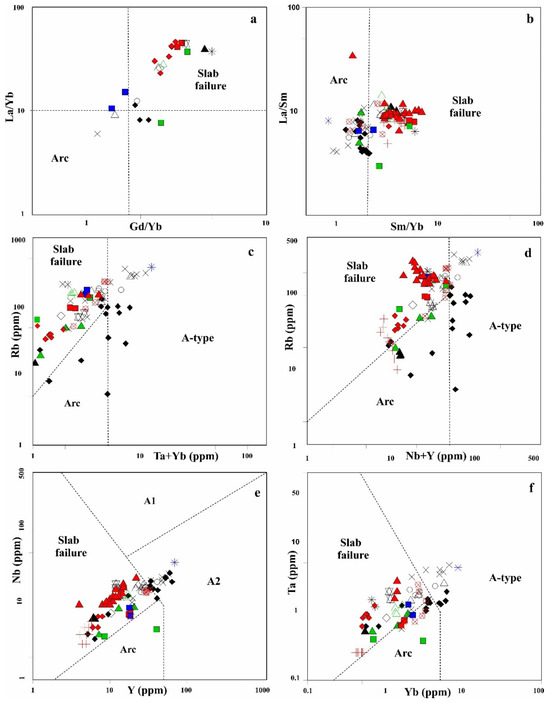- Whalen, J.B.; Hildebrand, R.S. Trace element discrimination of arc, slab failure, and A-type granitic rocks. Lithos 2019, 348, 105179. [Google Scholar] [CrossRef]