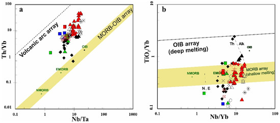 - Pearce, J.A. Immobile element fingerprinting of ophiolites. Elements 2014, 10, 101–108. [Google Scholar] [CrossRef]