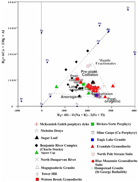 - Batchelor, R.A.; Bowden, P. Petrogenetic interpretation of granitoid rock series using multicationic parameters. Chem. Geol. 1985, 48, 43–55. [Google Scholar] [CrossRef]