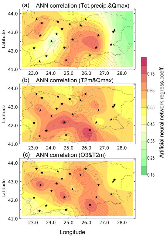 The irregular distribution of the maximum streamflow trend over the territory of Bulgaria raises the question of the forcing factors that lead to this heterogeneity. As mentioned in the introduction, river discharge is directly related to precipitation and surface temperature. In order to reveal some similarities in the temporal evolution of maximum river discharge (Qmax), precipitation and temperature, we conducted an artificial neural network analysis in each hydrological station. The spatial distribution of the calculated correlation coefficients between modelled values of Qmax and its predictors, i.e., precipitation, surface temperature and ozone, is shown in Figure 3. To facilitate comparison, the contours of the maximum streamflow trends are superimposed on the regression maps.