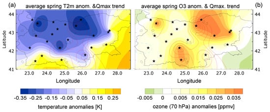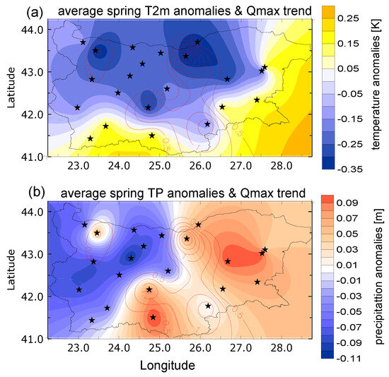 On the other hand, the regions of stronger correlation between near-surface temperature and the highest spring streamflow coincide quite well with the spatial distribution of the positive streamflow trend (Figure 3b). This suggests that at most stations, the maximum spring discharge should be related to the melting of snow and ice, which is closely related to surface temperature. However, the latter is irregularly distributed over Bulgaria. Figure 4 shows the average distribution of the near-surface temperature anomalies during the analysed period 1993–2022. Note that the areas with negative temperature anomalies (Figure 4a) are very similar to the areas with positive spring discharge trends.