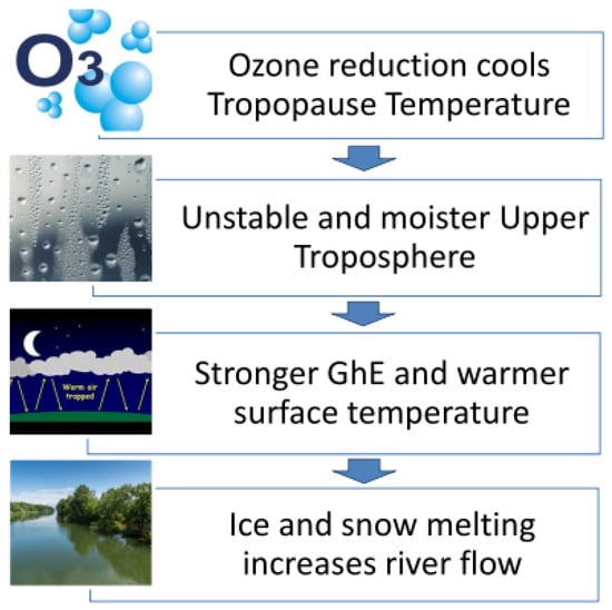 The rest of the link between ozone and river discharge is easy to understand—additional surface warming in spring forces snow and ice to melt, increasing river flow. A schematic drawing of the links of changes related to the variations of the ozone at the tropopause level is provided in Figure 6. Climatological studies show that the months with the highest spring runoff are characterised by minimum precipitation [12,13,14]. Consequently, the highest surface runoff should be attributed to melting snow and ice.
