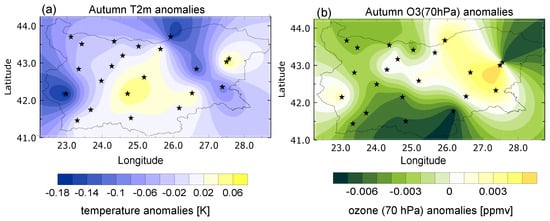 Maps of the autumn near-surface temperature (a) and ozone at 70 hPa (b) dynamic anomalies, calculated for the period 1993–2022 (coloured shading). Stars indicate the location of hydrological stations.