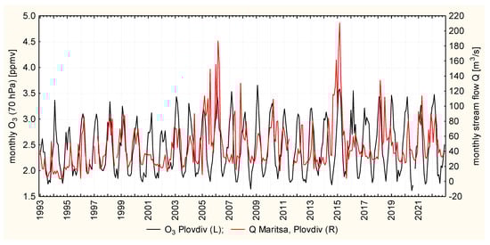 Time series of the monthly discharge of the Maritsa River, measured in Plovdiv, and the ozone values at 70 hPa, over Plovdiv, for the period 1993–2022.