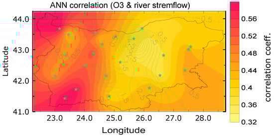 The degree of similarity between the temporal evolution of ozone at 70 hPa and river discharge (using the whole time series) was estimated by the artificial neural network approach. A model of runoff variability based on the corresponding ozone data was constructed for each hydrological station. The degree of similarity between the modelled and measured streamflow is given by a correlation coefficient—the stronger the correlation, the greater the influence of ozone on streamflow. These correlation coefficients (calculated for each station) were used to generate a map of the similarity between ozone and river discharge over time (see Figure 9).