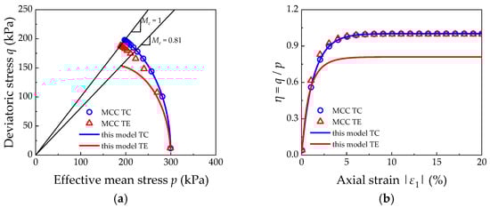 To verify the accuracy of this model, a series of conventional triaxial tests (element tests) are first conducted in FLAC3D. The basic model parameters are shown in Table 2, while the fabric parameters are set as Δ = 1/3 and β = = 0. This configuration is chosen to temporarily ignore the effects of anisotropy and focus solely on verifying whether Lade’s strength criterion is successfully incorporated into the model. The sample is subjected to isotropic consolidation with p = 300 kPa and subsequently undergoes triaxial compression (TC) and triaxial extension (TE) loading under both drained and undrained conditions. For comparison, the MCC model in FLAC3D is used with the same model parameters for simulation. Figure 2 shows the calculation results of the MCC model and this model, where the symbols represent the calculation results of the MCC model, and the lines represent the simulation results of this model. Under TC conditions, the mechanical response predicted by this model aligns almost perfectly with that of the MCC model, confirming the correctness of this model. However, under TE conditions, the MCC model predicts identical ratios for the critical state stresses under compression and extension (i.e., = , q/p = constant). This is because the strength envelope of the MCC model forms a circle in the π-plane. Such predictions of the MCC model are evidently inaccurate, as numerous experiments have demonstrated that the tensile strength of soils is lower than their compressive strength [,]. In contrast, the proposed model successfully captures the difference between extensile and compressive strengths, indicating that the yield surface of the MCC model has been effectively extended to the three-dimensional stress space.