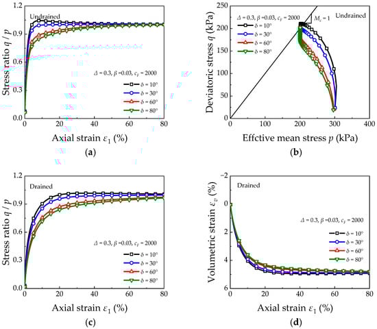 Mechanical responses of this model under drained and undrained conditions (Δ = 0.3, β = 0.03, = 2000): (a) stress ratio–strain curves under undrained conditions; (b) effective stress paths under undrained conditions; (c) stress ratio–strain curves under drained conditions; (d) dilatancy behaviors under drained conditions.