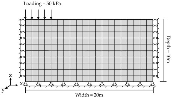 To investigate the effects of anisotropy on typical geotechnical engineering problems, the proposed model is used to simulate the embankment loading case provided by the FLAC3D []. The dimensions and boundary conditions of the model are shown in Figure 6. Consistent with the MCC model, the basic parameters of this model are set as M = 0.888, v = 0.3, λ = 0.162, κ = 0.062, and the reference void ratio = 1.858 when p = 1 kPa. The density of the soil is set to 2 × 103 kg/m, while the permeability is set to 1 × 10−8 m/s. The foundation is assumed to be lightly over-consolidated with = 160 kPa. The simulation consists of two stages: in the first stage, an embankment load of 50 kPa is applied to the 4 m section on the left side of the top boundary of the model, with no fluid flow during this stage, corresponding to undrained conditions; in the second stage, fluid flow is permitted to simulate approximately three years of consolidation, corresponding to drained conditions. Further details about the simulation can be referenced from the help documentation of FLAC3D []. It should be noted that before starting the calculations, for the anisotropic model, the initial value of the hardening parameter needs to be determined using Equation (19).