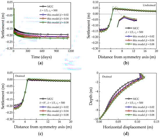 As the first calculation, the fabric parameters are set to Δ = 1/3 and = 500, while β is varied from 0.02 and 0.08. The purpose of this setup is to make the initial state of this model equivalent to the initial isotropic state of the MCC model, thereby considering only the effects of anisotropic evolution. Figure 7 shows the mechanical responses of the saturated soil foundation predicted by the MCC model and this model. The predicted settlements versus time at the ground surface along the centerline of the embankment are presented in Figure 7a for approximately 3 years of consolidation time. It can be observed that the settlement predicted by the MCC model is approximately 0.193 m, while this model predicts a final settlement of 0.209 m (β = 0.02), and the predicted settlement increases with the parameter β. Interestingly, Karstunen et al. [] and Yildiz et al. [] have conducted similar comparative validations and found that considering anisotropy led to higher predicted final settlements compared to the MCC model. This highlights the necessity of accounting for anisotropy in practical engineering problems to avoid unrealistic predictions. Figure 7b,c present the surface settlement troughs during the undrained and drained stages, respectively. It can be observed that in the undrained stage, both the MCC model and the anisotropic model predict noticeable surface heave, with the anisotropic model forecasting a more pronounced degree of both surface heave and settlement. During the drained consolidation stage, the anisotropic model predicts higher settlement values. These trends align well with the conclusions drawn from the study by Karstunen et al. []. Figure 7d illustrates the variation in lateral displacement with depth at x = 4.5 m during the drainage phase. It can be observed that the anisotropic model predicts greater lateral displacement compared to the MCC model, a similar trend also identified by Yildiz et al. [].