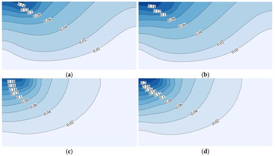 Total displacement contours near excavation area with constant OCR = 2.5 and K0 = 0.56: (a) predicted by MCC model; (b) predicted by this model (Δ = 0.3, β = 0.09, = 150). (c) Predicted by this model (Δ = 0.3, β = 0.1, = 150); (d) predicted by this model (Δ = 0.3, β = 0.11, = 150).