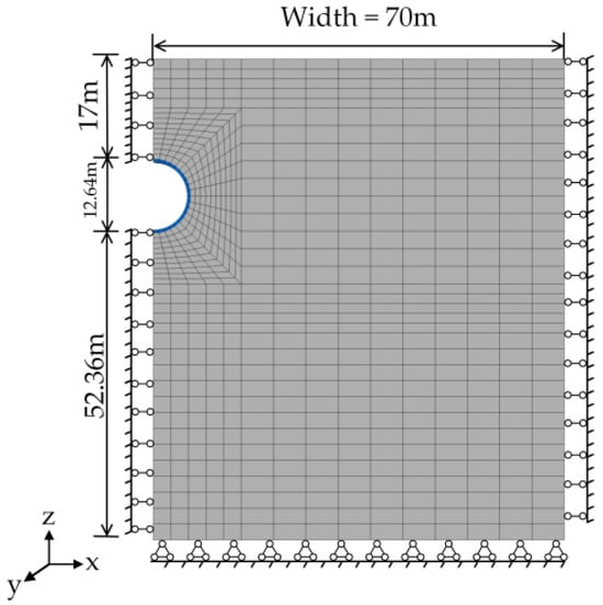 The final case study focuses on a tunnel excavation simulation, using the Qinghuayuan Tunnel shield tunneling project as the background to analyze the impact of construction on ground disturbance []. A half model is established as shown in Figure 9, with a domain width of 70 m and a depth of 82 m, and the tunnel axis is located at a depth of 23.32 m with a radius of 6.32 m. Horizontal constraints are applied to the surrounding boundaries, while both horizontal and vertical constraints are applied to the bottom boundary. The top of the model is set as a free boundary. According to the work of Cui [], the soil layers in this region mainly consist of silty clay and sandy pebbles, with sandy pebbles being the most representative. For simplicity, the region was simplified as a homogeneous pebble layer. The soil parameters were recorded as effective friction angle φ′ = 45°, Poisson’s ratio v = 0.28, unit weight = 20.2 kN/m3, and plastic index Ip = 11.6. Based on these parameters and the work of Nakase et al. [], the basic parameters for the MCC model and this model can be approximated as follows: