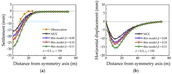 It is assumed that the reference void ratio of the soil at p = 1 kPa is 1.094, and the OCR = 2.5. Using the empirical formula = (1 − sinφ′) × OCRsinφ′ [,], the static lateral earth pressure coefficient is approximately 0.56. For comparison, the basic material parameters (i.e., M, λ, κ, v and ) of the MCC model and the model in this study are kept consistent. To study the effect of anisotropy on soil disturbance, the fabric parameters of the model in this study are set as Δ = 0.3, = 150, and β varies between 0.09 and 0.11. Figure 10a shows the surface settlement trough observed in the experiment, predicted by the MCC model, and predicted by the model in this study. It can be seen that the MCC model underestimates the maximum settlement value, while the model in this study provides a better representation of the actual settlement. However, although fabric anisotropy has been introduced into the MCC model, it primarily affects the settlement depth without significantly altering the shape of the settlement basin, which differs from the shape observed in practice. Similar patterns were also noted by Karstunen et al. [] and Yildiz et al. []. According to the work of Xiao et al. [], this may be because the MCC model does not account for the difference in elastic modulus during loading and unloading. Figure 10b shows the horizontal displacements predicted by both models. It can be observed that the anisotropic model predicts larger horizontal displacements, which is consistent with the observations reported by Cui []. However, it is worth mentioning that in the anisotropic model proposed by Cui [], a significant soil arching was observed around the soil surface at x = 20 m, which does not align with the experimental observations. This discrepancy may be due to the fact that the anisotropic model proposed by Cui [] is established on the M-C model, which uses the ideal plasticity theory. This theory assumes that the soil does not exhibit subsequent hardening behavior, which may lead to an overestimation of the soil arching. Figure 11 shows the total displacement contour plots near the excavation area predicted by the MCC model and the model in this study. It can be observed that the displacement distribution predicted by both models is generally consistent. However, for the model in this study, as parameter β increases, the displacements near the crown and shoulders of the excavation area significantly increase. This indicates that the effect of anisotropy on the disturbance of the soil layers during excavation should not be overlooked.