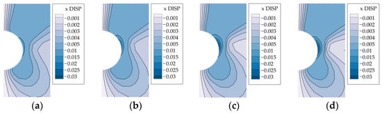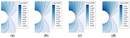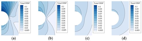 Total displacement contours near excavation area with constant OCR = 2.5 but different K0: (a) K0 = 0.3; (b) K0 = 0.5; (c) K0 = 0.8; (d) K0 = 1.0.