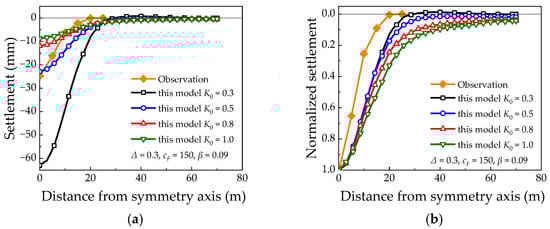 In order to investigate the effect of the static lateral pressure coefficient on the soil disturbance caused by tunnel excavation under anisotropic conditions, a series of values are selected for the simulations ( = 0.3, 0.5, 0.8, and 1.0). Figure 12 shows the simulation results of this model with constant OCR = 2.5 but different , while the fabric parameters are set as Δ = 1/3, = 150, and β = 0.09. From Figure 12a, it can be seen that as increases, the vertical settlement at the soil surface decreases. Figure 12b shows the normalized surface settlement under different conditions. It can be observed that not only affects the depth of the settlement trough but also influences its width. Specifically, lower values of predict narrower settlement troughs. This could be due to the fact that as decreases, the mean effective stress p in the soil decreases, and, as can be seen from Equation (17), the stiffness of the soil also decreases accordingly. This trend is consistent with the observations made by Cui [] and Dolezalova []. Figure 13 shows the total displacement contours under different conditions. It can be observed that as increases, the soil displacement near the excavation area significantly decreases. Therefore, it can be concluded that the resistance of soil to disturbance during tunnel excavation is sensitive to , and the value of should be determined as accurately as possible during site investigation.