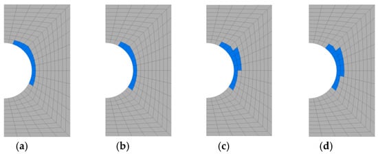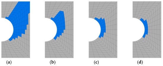 Plastic region (blue region) near excavation area predicted by this model with constant K0 = 0.56, but different OCR: (a) OCR = 1.6; (b) OCR = 1.9; (c) OCR = 2.2; (d) OCR = 2.5.