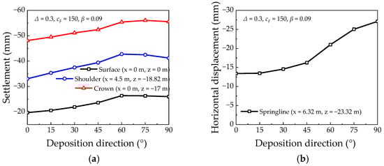 In order to investigate the effect of initial anisotropy on tunnel excavation, this study set up two sets of numerical tests. Both sets of experiments have the same OCR = 2.5 and = 0.56, and the fabric parameters are set as = 150 and β = 0.09. In one set of tests, the angle δ between the deposition plane and the z-axis is varied between 0° and 90° with Δ = 0.3. In the other set, the value of initial anisotropy Δ is varied between 0.2 and 0.32 while δ = 0°. Figure 16a shows the relationship between settlement at various positions and δ. It can be observed that as δ increases, the settlement at each position (surface, shoulder, crown) first increases, reaching a maximum between approximately δ = 60 and 75°, and then decreases as δ continues to increase. Figure 16b shows the relationship between horizontal displacement at the springline and δ. It can be observed that horizontal displacement increases as δ increases. This may be because, as the deposition direction gradually deviates from the z-axis, the stiffness of the soil decreases, which leads to an initial increase in vertical settlement. As δ continues to increase, the horizontal displacement at the springline continues to grow, and due to compression, the vertical settlement starts to decrease. Figure 17 shows the distribution of horizontal displacement near the excavation area under different δ conditions. It can be observed that for different scenarios, the maximum horizontal displacement is concentrated at the springline, and as δ increases, the maximum horizontal displacement increases.