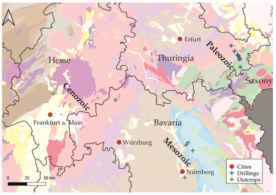 Locations of sampled rocks in Central and Southern Germany. Blue and green crosses depict sampling areas by drilling and outcrops. Geological eras only indicate age of samples; color scheme of geological units can be found in the base map source: General Geological Map of Germany (GUEK200) [].