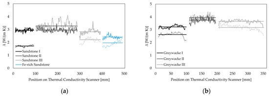 All in all, all samples are representative in terms of their geochemical composition. In terms of thermal conductivity, the range of measured values is significantly greater and often highly heterogeneous depending on the microstructural composition. This is particularly the case with sedimentary and metamorphic rocks. The λ-values for the sampled rocks are located in a range of generally applicable literature, such as VDI 4640-1 [], and can be found in other studies [,,].
