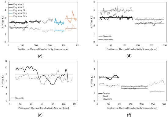 Thermal conductivity measured with a thermal conductivity scanner (TCS) along each sample. Dashed lines represent thermal conductivity in a dry state; solid lines are thermal conductivity measurements in a saturated state. Solid horizontal bars display the mean values, with the relative standard deviation (RSD) of each measurement displayed in Table 4. (a) Sandstones; (b) greywackes; and (c) clay slates. Note: p: measurement parallel to foliation; o: measurement orthogonal to foliation; (d) carbonates; (e) quartzite; and (f) igneous rocks and claystone.