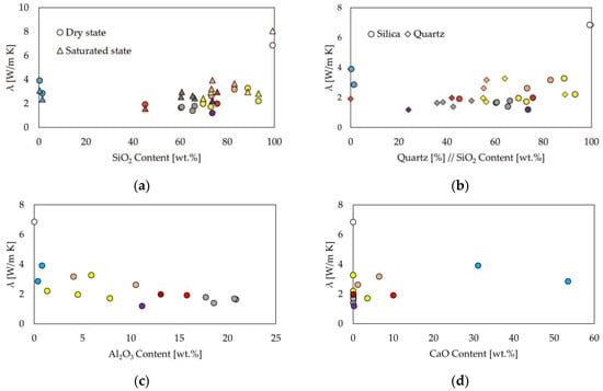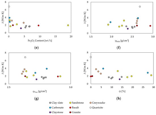 The chemical composition has a decisive influence on thermal conductivity. Figure 4a,b show the thermal conductivity in relation to the SiO2 and quartz contents. This shows the much-described trend of increasing thermal conductivity with increasing quartz content, as well as SiO2 [,,], with the exception of carbonate rocks. Rocks with a high proportion of aluminum silicates, which are frequently found in clay minerals, have a lower thermal conductivity. The ratio of Al2O3 to SiO2 is the highest in metamorphic slates and claystone, which have the lowest thermal conductivity, also visible in Figure 4c. Bulk density and true density show diverging values when compared with the thermal conductivity; porosity ranges up to approx. 29% without any significant correlations visible (Figure 4f–h). Values of ρtrue provide a better understanding of the mineral and grain densities. The influence of CaO (Figure 4d) is not visible from the data in this study.