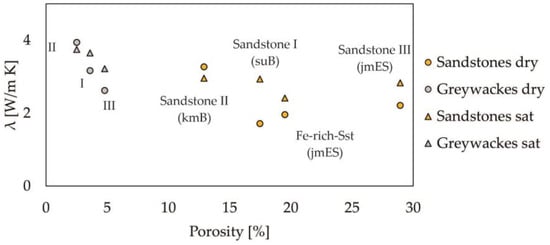 The pore volume or porosity and density of materials have a great influence on thermal properties. Thermal conductivity of bodies with random porosity, as in the case of most rocks, is decreased proportionally to the volume pore fraction []. Porosity is related to the internal rock structure and geometry while processes after rock forming can also have a great impact []. In the case of the samples in this study, the factor of alteration must be considered since the samples are all from very shallow drillings and outcrops. Furthermore, sedimentary samples and potentially hydrothermal altered samples, such as the metamorphic clay slates, are subject to different forms of intergranular cementation [,,]. Porosity favors possible saturation and can thus contribute to an increase in thermal conductivity. We observed that the Mesozoic sandstones and Paleozoic greywackes show relatively low values of thermal conductivity with increasing porosity (see Figure 5). In the case of these sediments, this correlation appears to be due to the low amount of pore volume or, conversely, the high proportion of cementation or matrix. This can, therefore, also be transferred to the noticeably more compact and finer graywackes. While the true density and bulk density of clay slates are relatively high due to metamorphic overprinting, porosity is more distinctive with the siliciclastic samples.