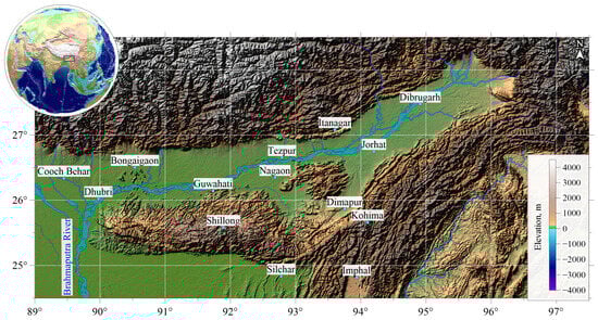 The region is traversed by the Brahmaputra River, which originates in southern Tibet and flows for 3410 km through China, India, and Bangladesh before emptying into the Bay of Bengal [11]. The Brahmaputra Valley in NE India, also known as the Assam Valley, stretches in an ENE-WSW direction and is flanked by two dynamic and youthful mountain belts. The valley is divided into three parts: the eastern Upper Assam Valley, the Central Assam Valley, and the western Lower Assam Valley [12]. The valley, particularly its eastern part, is known for rich hydrocarbon and mineral resources, underscoring its importance for economic development and energy production.